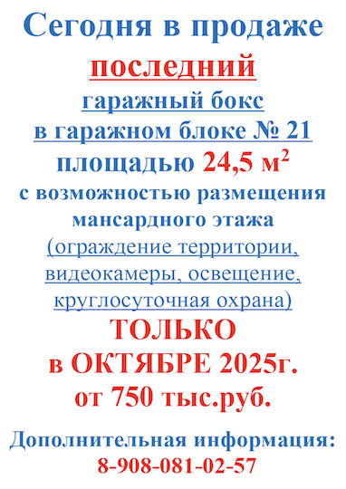Последний гаражный бокс в блоке №21 ![]() Площадь бокса от 24,5 м2 От 750 тыс. руб. в октябре 2025 г.